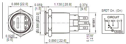 SPDT, (On) On, flat button with 24V blue LED lighted dot, solder lug terminal