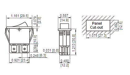 into the standard panel cut-out: 0.492 x 1.075" (12.5 x 27.3mm). The switch is DPSP or SPST On.Off, and