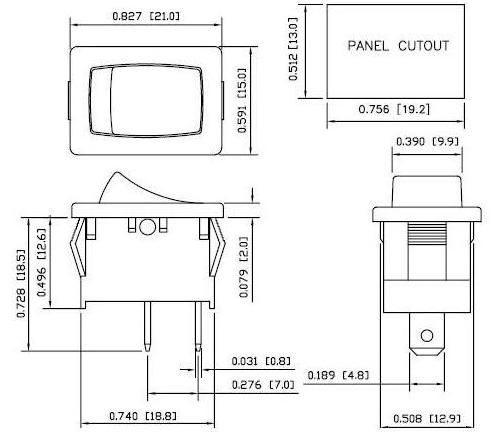 into the industry standard panel cut-out: 0.512 x 0.756" (13.0 x 19.2mm). The switch comes in Single pole with multiple