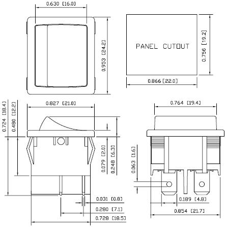 into the standard panel cut-out: 0.866 x 0.756" (22.0 x 19.2mm). The switch is DP with many functions, including