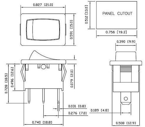 into the industry standard panel cut-out: 0.512 x 0.756" (13.0 x 19.2mm). The switch is SPST On/Off illuminated in red , green , amber and other colors. PVC